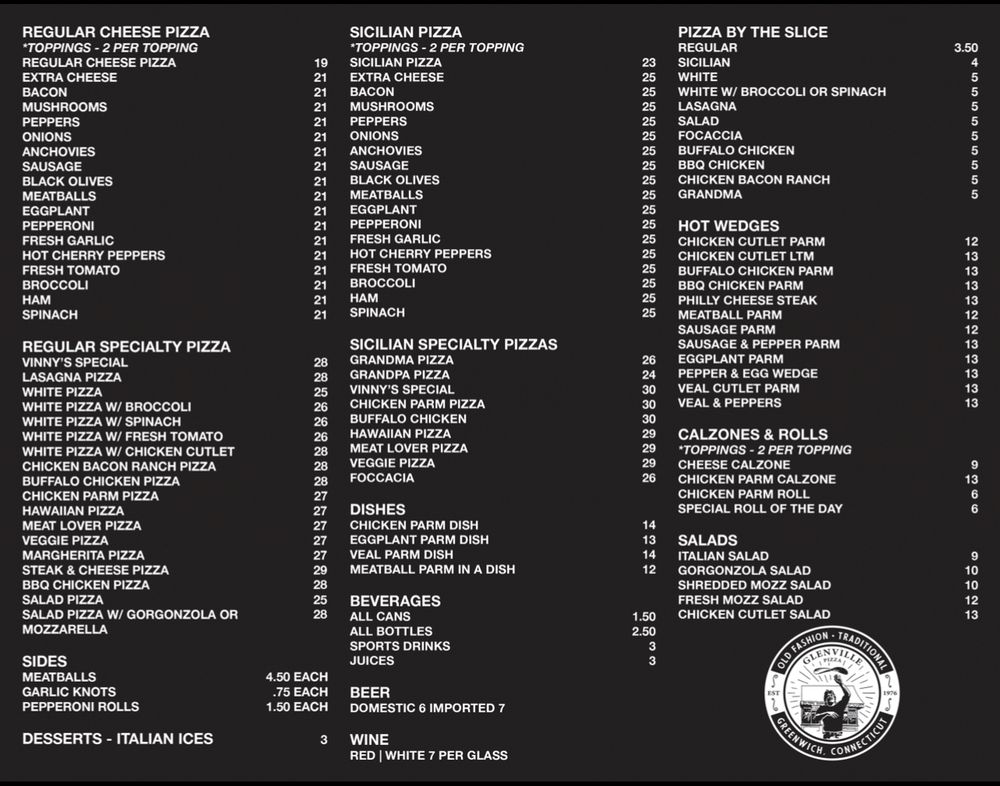 Glenville Pizza, located in Greenwich, CT, offers a variety of delicious pizzas with many vegetarian options. Customers rave about the Sicilian pie and Vinny's special, praising the perfect dough and generous toppings. The casual atmosphere, outdoor seating, and friendly service make it a great spot for groups, kids, and even a quick lunch or dinner. Customers appreciate the welcoming staff and the high-quality, fresh ingredients used in the pizzas. With options for delivery, takeout, and catering, Glenville Pizza is a go-to for pizza lovers in the area. Don't forget to bring cash, as it's cash-only, but the amazing flavors and warm hospitality make it worth a visit.